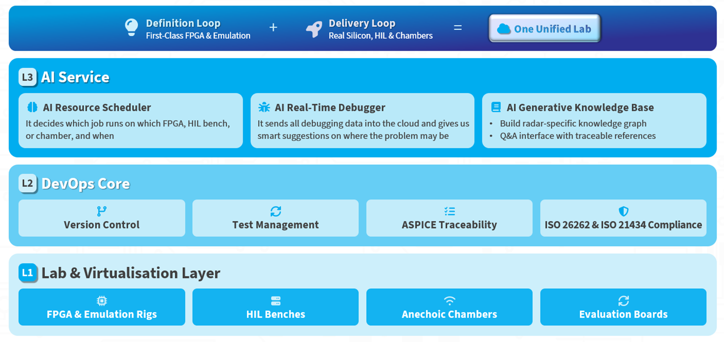 郑珉楠介绍道,为解决这些问题,加特兰创新性地推出了Radar Cloud Lab——一个以芯片为核心、AI驱动的毫米波雷达DevOps平台,即贯穿芯片全生命周期的AI云实验室。其核心架构包括: