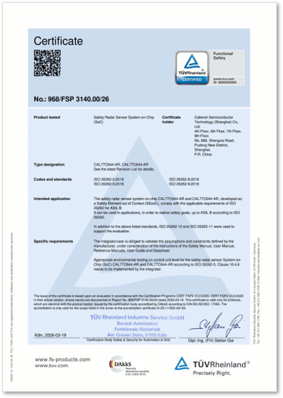 2026年3月19日,加特兰Andes系列毫米波雷达芯片产品(CAL77C844-AR、CAL77C644-AR)正式通过德国莱茵TÜV的严格审核评估,获得ISO 26262 ASIL-B功能安全产品认证。