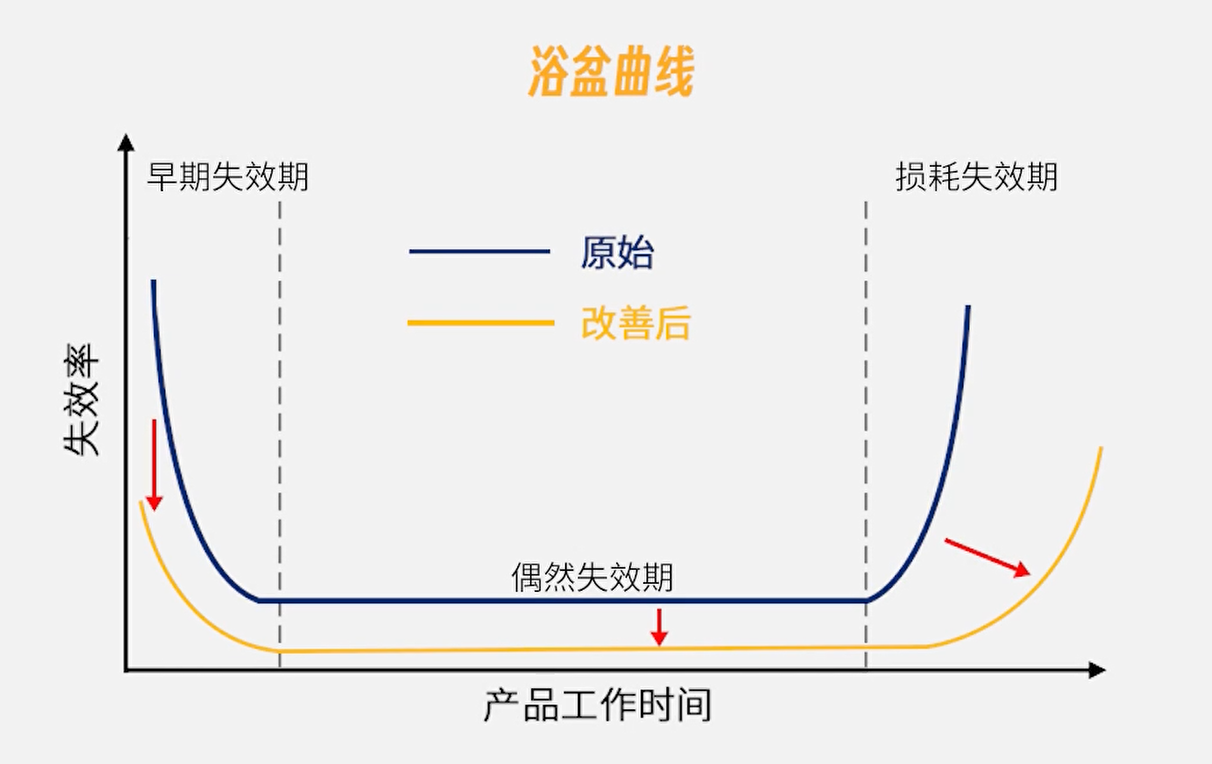 产品失效往往遵循浴盆曲线:早期失效率高,随后进入稳定的偶然失效期,最终随着产品老化而再次攀升。