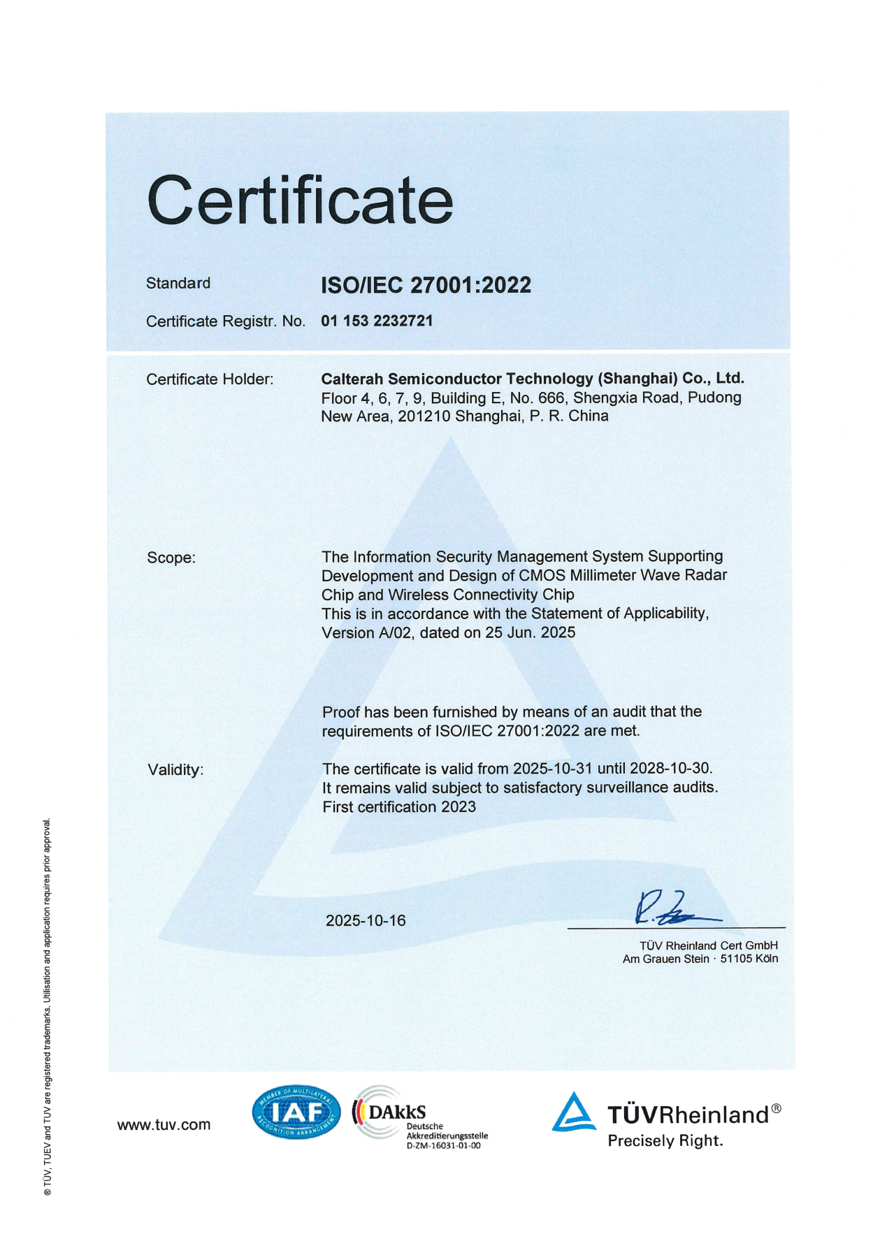 Faced with increasing threats to information security globally, Calterah has established an information security management system certified compliant to ISO 27001 by TÜV Rheinland, to protect its core competitiveness and enhance trust from global customers and partners. Adhering to the information security policy of “We ensure legal compliance, data confidentiality, information integrity, and risk control and strive for continuous improvement”, Calterah has identified, evaluated, and controlled information security risks, guaranteeing the continuity of its business operation. Calterah is also constantly seeking improvement to better tackle ever-changing and complex information security challenges.