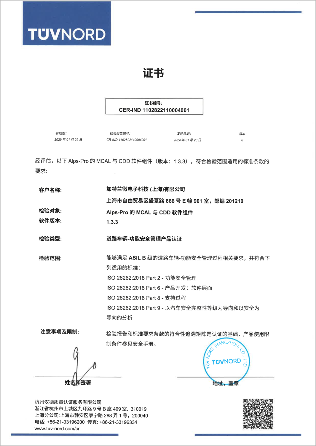 经TÜV NORD的严苛评估,加特兰Alps-Pro的MCAL与CDD软件组件正式通过了ISO 26262 ASIL-B产品认证,认证范围包括9个常规的MCAL组件以及7个与雷达驱动相关的CDD组件。经审核,加特兰Alps-Pro MCAL与CDD的软件开发流程符合ISO 26262 ASIL-B的相关安全管理要求,其软件组件符合相关安全开发要求。作为为数不多通过MCAL与CDD软件功能安全产品认证的公司,这是对加特兰软件研发体系高水平质量管理的充分认可,也是对加特兰产品的开发流程管理、安全架构设计、安全编码和安全测试等各个环节严格遵循高标准的肯定。